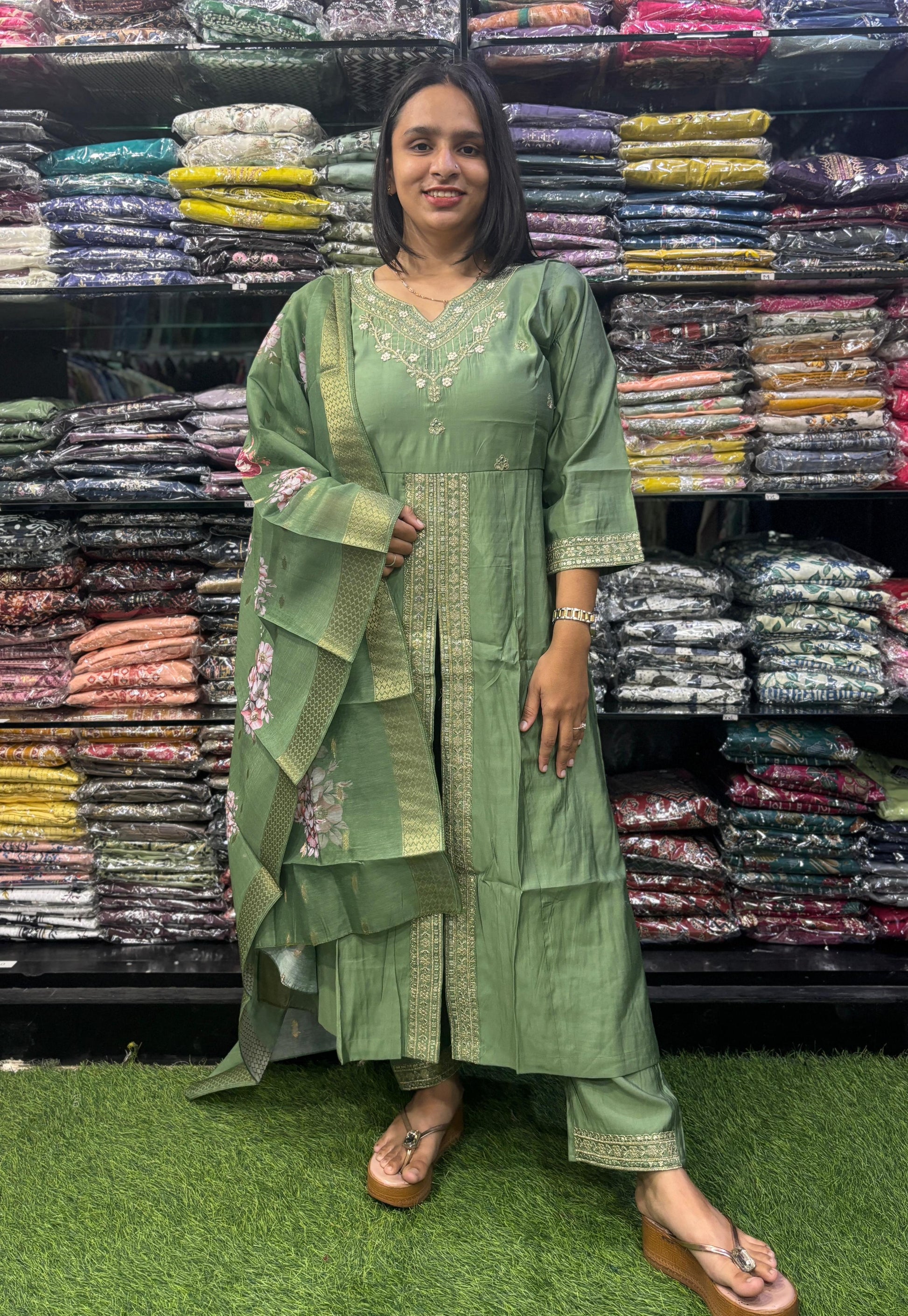 ALINE KURTI PENT DUPATTA (ROMAN SILK(COTTON LINING),WITH WORK)