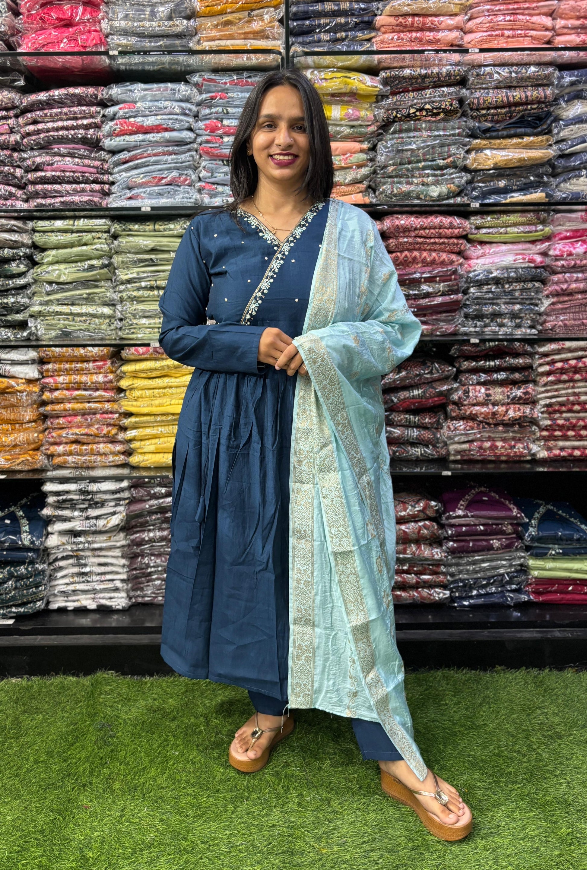 ROUND KURTI PENT DUPATTA (VERTICAN SILK (COTTON LINING) ,WITH WORK)